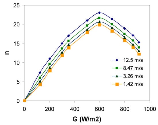 Figure 10a shows TEG power output depending on wind speed and solar radiation intensity. It can be seen that, as the intensity of solar radiation increases, the output power of the TEG module also increases [42]. However, increasing wind speed increases the temperature gradient, which translates into the of the TEG module power output. Therefore, as seen from Figure 10b, as the wind speed increases, the efficiency of the TEG module increases approximately with the second order inertial. The power output of TEG system increases with increase, both in solar radiation and number of thermocouple elements, due to a higher heat input. This is considered to be an important finding that will help in accurately choosing a TEG temperature value and in applying geometrical configuration to reach the maximum efficiency.
