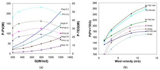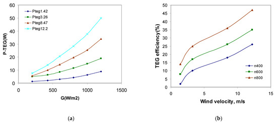 Change in the output power generated by the TEG cell depending on wind speed and solar radiation intensity: (a) TEG efficiency depending on wind velocity (1.42; 3.26; 8.47; 12.2 m/s), (b) TEG efficiency depending on wind velocity and radiation intensity (400; 600; 800 W/m2).