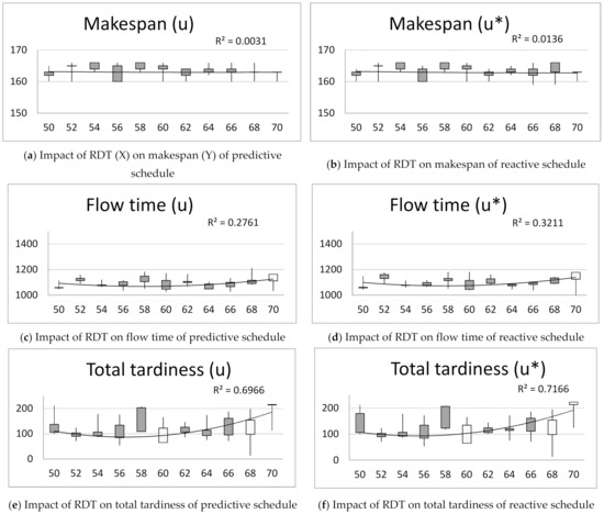 The total tardiness decreases with increasing the disturbance-free operation of the FDM. After reaching the peak value of RDT = 58, the total delay increases with the failure-free time of the FDM machine (Figure 1e,f).