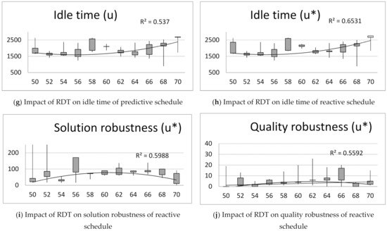 Next, the impact of the FDM machine uptime on: the solution robustness and quality robustness is investigated (Figure 1g,h). The following phenomenon can be noticed: The solution robustness of predictive schedules decreases with the disturbance-free operation of the FDM machine. After reaching the peak value of RDT = 60, the solution robustness increases with the failure-free time of the FDM machine (Figure 1g).
