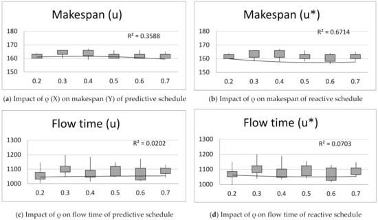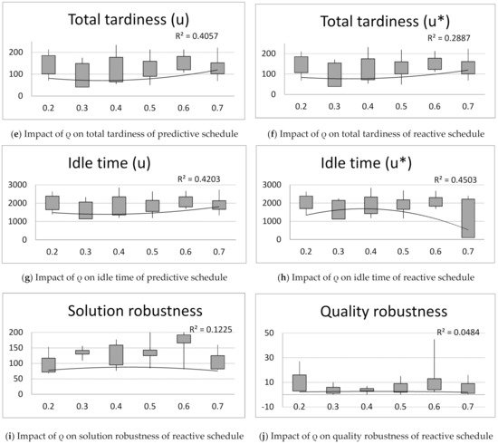 Additionally, the impact of parameter q on the solution robustness and quality robustness is investigated. The solution robustness of predictive schedules increases with increasing value of parameter q. After reaching the peak value for Parameter q = 0.5, the solution robustness decreases with the value of q (Figure 5g). Parameter q has little impact on the quality robustness (Figure 5h).
