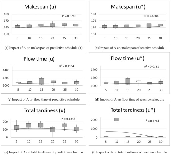 The total tardiness decreases with increasing size of ant population A (Figure 3e,f).