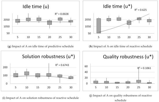 Next, the impact of the size of ant population A on the solution robustness and quality robustness is investigated (Figure 3g,h). The following phenomenon can be noticed: The solution robustness of predictive schedules decreases with increasing value of ρ. After reaching the peak value for A = 15, the solution robustness increases with the value of A (Figure 3g).