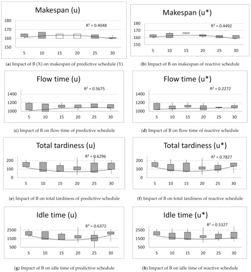 The total tardiness decreases with B. After reaching the peak value of B = 20, the total delay increases with B (Figure 4e,f).