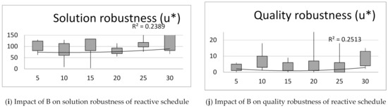 Next, the impact of number of ants on the solution robustness and quality robustness is investigated. The solution robustness of predictive schedules slightly increases with increasing value of B. After reaching the peak value for B = 15, the solution robustness decreases with the value of B (Figure 4g). The same phenomenon is noticed for the quality robustness (Figure 4h).