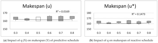 Parameter q0 has little impact on the makespan criterion of predictive schedules (Figure 5a). The makespan decreases with increasing parameter q. After reaching the peak value of q = 0.6, the makespan increases with q for reactive schedules (Figure 5b).