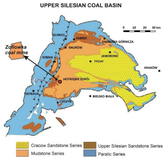 The area of study is located within the Upper Silesian Coal Basin. This basin was formed during the Varisician orogeny, mainly in the Asturian stage [58]. It is a piedmont subsidence formed as a synclinal basin, filled with coal-bearing formation dating to the Upper Carboniferous period [59]. The Basin is divided into three zones with different tectonic styles: fold, fold-block and disjunctive styles [60]. The area of study is located within a disjunctive tectonics area, which covers the majority of the Upper Silesian Basin. The formation of this area is related to the block structure of the substrate, with faults as its main structural element. The Alpine orogeny had a significant impact on the structure of this area and of the entire Basin, as in this period a large number of faults was reanimated, with their amplitudes increased. The area of study includes the Zofiówka Mine seams available for sampling in 2014. The mine is located in the so-called Zofiówka monocline [61], entirely located within the disjunctive tectonics area (Figure 1). The coal deposits of the Zofiówka consist of multiple seams, down to the depth of 1080 m [62]. 42 seams were located within the deposit, including 5 “Orzeskie”, 30 “Rudzkie” and 7 “Saddle” seams. Numerous hazards were identified in the mine, including methane and rock outbursts.