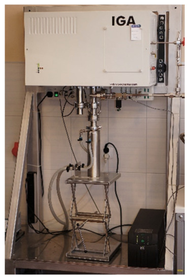 The goal of the sorption tests was to determine methane sorption isotherms at the mean deposit temperature (35 °C) and in the methane pressure range from 0 to 1.0 MPa, including kinetic curves. Measurements were performed using the gravimetric method and an IGA-001 sorption analyser by Hiden Isochema (Figure 2). Dry samples of coal in the 0.16 ÷ 0.25 mm class were used in the measurements, degassed at 80 °C for approximately 10 h, down to p = 10−6 mbar. Sorption isotherms were prepared on the basis of measurements of the quantity of absorbed methane for the following equilibrium pressures: 0.1 MPa (ambient pressure), 0.3 MPa and 1.0 MPa. The Langmuir isotherm model (1) was used to describe methane sorption on the studied coals in the form of [26]: