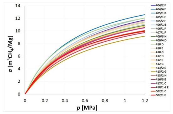 By comparing the sorption capacities summarised in Table 2, it can be observed that in the maximum sorption range (the am value), the studied coals show a methane accumulation capacity between the value for the 413/2 G coal sample (14.15 m3CH4/Mg), and the quantity absorbed by the 405/2 F coal sample (18.25 m3CH4/Mg). Therefore, the course of methane sorption isotherms is slightly varied and the curves may intersect in some cases. As it may be seen from Figure 4, the isotherms more steeply inclined in the low-pressure range (lower value of the pL parameter) may quickly reach a plateau (e.g., sample 409/4 D), while a different curve, less inclined in the low pressure area, may have a much higher maximum sorption capacity (e.g., sample 405/2 F).