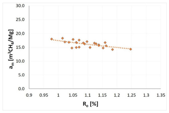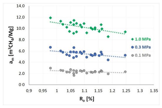 According to numerous literature sources, the degree of coalification, determined, e.g., on the basis of vitrinite reflectance, is the decisive key parameter for sorption properties of coal [26,71,72,73]. Figure 5 and Figure 6 present the relationships enabling the evaluation of the influence of the degree of coalification of coals prone to outburst on the sorption capacity of coal a under a given pressure—successively: 0.1 MPa, 0.3 MPa and 1.0 MPa, and on the maximum sorption capacity am.