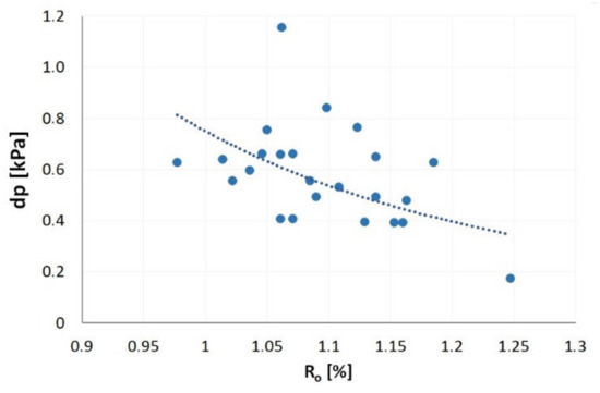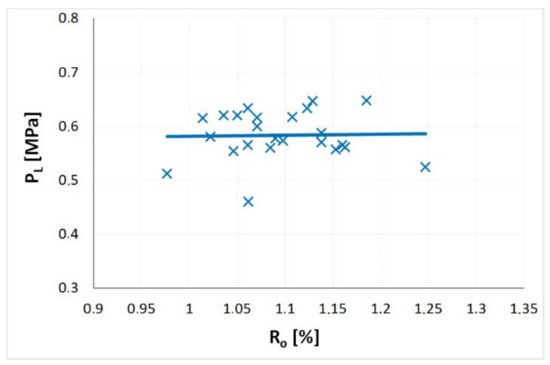 Figure 7 shows the influence of the degree of coalification on the value of Langmuir half sorption pressure . In the range of the examined reflectances, from 0.98% to 1.25%, the coal rank change does not impact the mean value of Langmuir pressure (Figure 7). Most of the results are in the range of 0.55–0.65 MPa. However. some oscillations of the around the mean value can be observed. An analysis of literature data does not yield clear answers as to the variability of the Langmuir’s pressure as a function of the coal rank. Laxminarayana and Crosdale [26] showed that a clear decreasing relationship between the degree of coalification and the Langmuir pressure exists in the Ro reflectance range from 0.78% to 3.01%. A similar trend is presented in a work by Dutta et al. [73] for the Ro range from 0.6% to 1.9%. Some works also indicate the presence of an inverse relationship, which means that the Langmuir pressure increases with the increasing degree of coalification in the Ro range from approximately 0.25% or 1.4% (i.e., Lama and Bodziony [17]).