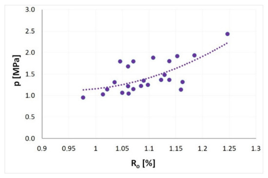 Figure 8 presents the influence of the degree of coalification on the coal seam methane pressure. According to the trend presented in Figure 8, the increase of the p value was approximately 3.3 MPa for every 1% increase of Ro. This means that in the case of the examined coals, a 0.1% increase of the degree of coalification results in an average increase of the coal seam methane pressure of approximately 0.33 MPa. The increasing trend of the coal seam methane pressure is caused mainly by the sorption properties of the seams, and in particular by the sorption capacity, which is reduced with increasing degree of coalification in the case of the examined coals. At constant total methane content, coals with stronger absorption performance (with lower Ro values) require lower values of the methane equilibrium pressure, in contrast with coals exhibiting weaker sorption properties (with higher coal ranks). Porosity is the second important factor influencing the division of seams into two groups. Coals with low and very low porosity require higher seam pressures in order to reach the methane balance for the seam at the level of Mn = 8 m3CH4/Mg.