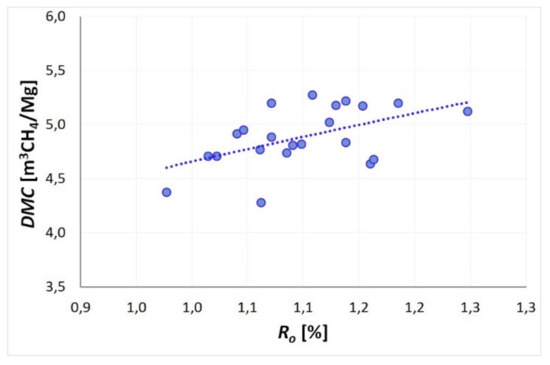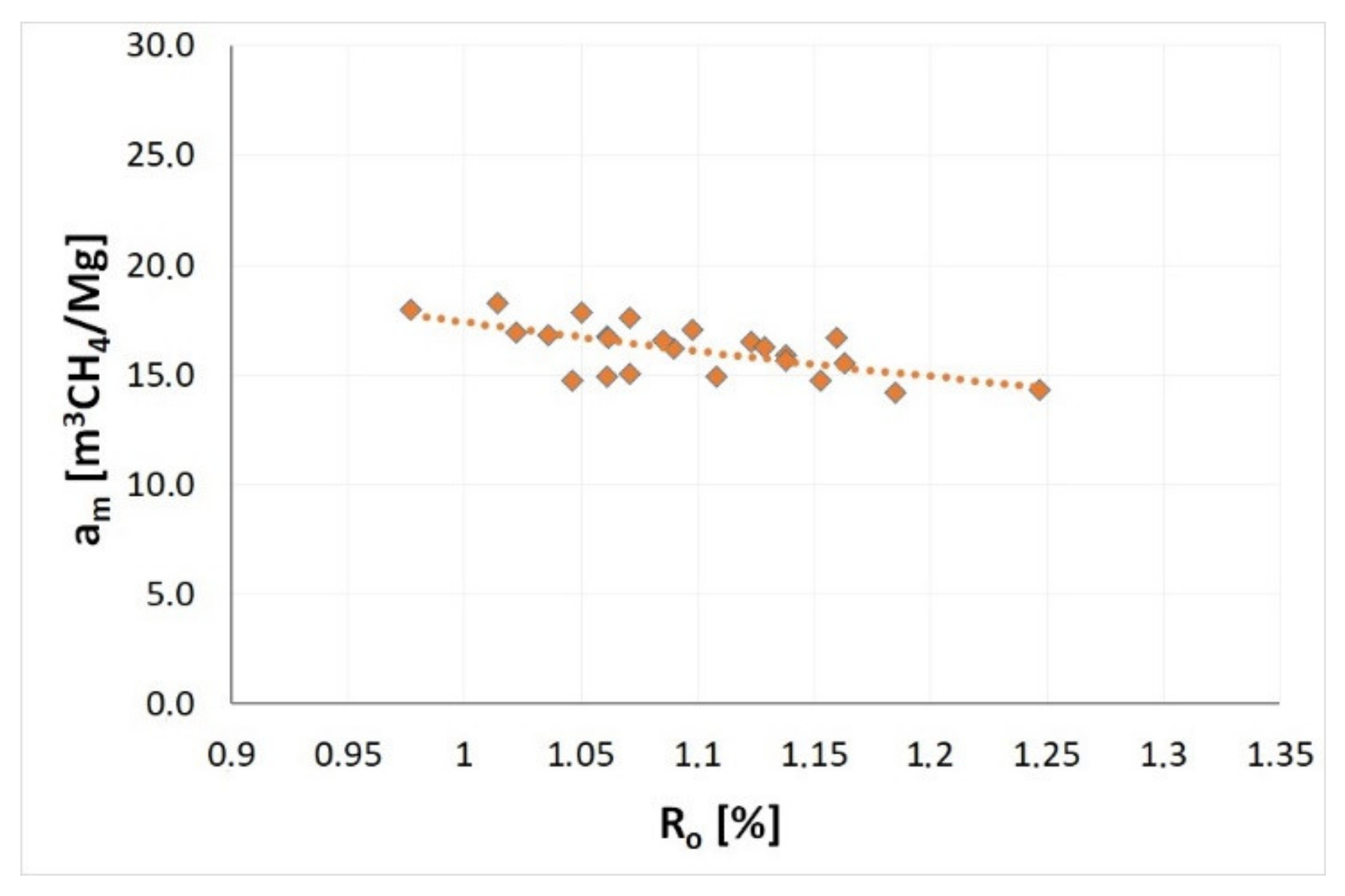 The assessment of susceptibility to outburst of coal seams requires information about the quantity of gas present in the coal. Methane in coal seams is present mainly as adsorbed gas in the microporous coal matrix, and to a small degree as a free gas in the system formed by macropores, cracks and fractures. Adsorbed methane constitutes more than 95% of methane present in the seams [31], therefore it determines their total methane content (Mn) [6,32]. The sorption capacity a is a quantitative parameter indicating the amount of methane absorbed in a mass unit of coal under sorption equilibrium conditions, constant temperature and gas pressure. In mining practice, the sorption capacity of coal under methane pressure of 0.1 MPa and at 25 °C (a0.1) is commonly used. By comparing the value of a0.1 with the total methane content Mn, it is possible to infer a potential increase in outburst risk. Special attention should be paid to situations where a high total methane content is accompanied by a relatively low sorption capacity a0.1. Such situations may indicate an increased coal seam methane pressure p and increased desorbable methane content (DMC), which may be released from the coal to the excavation. The most important factors influencing the sorption capacity of coal include pressure, deposit temperature, moisture content, the degree of coalification of the coal substance, the maceral composition and lithostatic loads [33]. Information on the effect of the degree of coalification is required to evaluate changes to the sorption capacity of coal seams with depth within the given mining area [7].