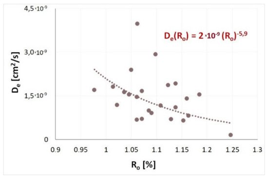 Assessment of hazards related to the presence of methane in coal seams is based on an analysis of the coal gas emission rate, which is simply indicated by an underground measurement of the desorption intensity index dp [34,35]. As a result, methane sorption or desorption kinetic properties are evaluated, which (as equivalent processes) are dictated by the value of the effective diffusion coefficient . This coefficient provides important information about the porous structure of coal and the gas transfer mechanisms within a seam [36]. Pressure, temperature [37,38] and moisture content [39] have a significant impact on the value of . The wide range of variability of methane diffusion coefficient values for coal, between 10−11 cm2/s and 5 × 10−7 cm2/s [36] allows coal types to be differentiated in terms of the potential methane and outburst risk. The high value of may also be a result of structural changes to coal [40], determining the outburst susceptibility of coals.