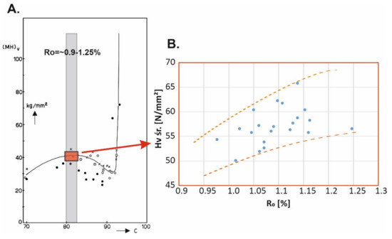 Coal is a biogenic sedimentary rock (a so-called caustobiolite), formed mainly from various plant remains that underwent coalification as a result of various transformations and varied conditions [27]. Such transformations result in an increase of the elemental C content in the sediment, accompanied by a reduction in the hydrogen and oxygen content (Schűrmann’s rule) [28]. At the same time, intensified coalification leads to a decrease in volatile content (Hilt’s law) [28,29]. Depending on the degree of coalification (coal rank), coal contains between 75% and 96% of elemental C within its structure. Evaluation of the coal rank is based on the result of vitrinite reflectance (Ro) measurements, which is a numerical expression of the ratio of the intensity of reflected light to the intensity of incident light radiated perpendicular to the polished sample (section) surface. Ro is a sensitive coalification parameter, and it is commonly considered to be an indicator of the coalification scale in solid fuels [27]. The degree of coalification is a parameter determining several coal properties. A higher degree of coalification results in a higher gloss, changes to microscopic properties (e.g., colour or structure), along with changes to strength properties [23,30], accumulation properties [24], etc. Therefore, assessment of the degree of coalification is the key and the starting parameter required for further studies of coal.