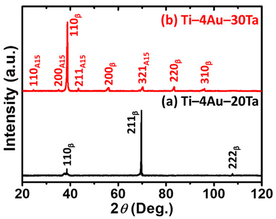 The X–ray diffraction patterns of the (a) Ti–4Au–20Ta alloy and the (b) Ti–4Au–30Ta alloy at RT under ambient are shown in Figure 1. Put simply, the parent β–phase was found in the (a) Ti–4Au–20Ta alloy indicating a single β–phase of this alloy. On the other hand, in addition to the parent β–phase, a compound with a crystal structure of A15 was also found in the (b) Ti–4Au–30Ta alloy. According to the literature [37,38], the compound possessing A15 crystal structure corresponds to the intermetallic compound of Ti3Au. More analysis concerning the Ti3Au with an A15 crystal structure are shown in Section 3.3 via microstructure observations and chemical composition analysis.