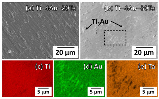 Figure 2a,b show the SEM images of the Ti–4Au–20Ta alloy and the Ti–4Au–30Ta alloy, respectively. In addition, the elemental mapping results of the (c) Ti, (d) Au, and (e) Ta elements in the Ti–4Au–30Ta alloy are also shown in Figure 2. The observed region of the elemental mappings is surrounded by the dashed lines in the SEM image of the Ti–4Au–30Ta alloy (Figure 2b).