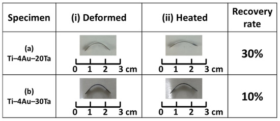 Similar to the (a) Ti–4Au–20Ta alloy, the apparent phase of the (b) Ti–4Au–30Ta alloy was also the parent β–phase before deformation; however, precipitates of Ti3Au compound was also found in the Ti–4Au–30Ta alloy (Figure 1b and Figure 2b–e). The deteriorated shape recovery rate of the (b) Ti–4Au–30Ta alloy could be attributed to the suppression of the phase transformation by the Ti3Au precipitates during bending deformation and shape recovery. These results are in accordance with those in the literature [38]. In addition to the inhibition of the phase transformation by the Ti3Au precipitates, the relatively low shape recovery rates (i.e., 10% and 30%) of these two alloys could also be ascribed to the plastic deformation, which was introduced into the alloys during bending deformation.