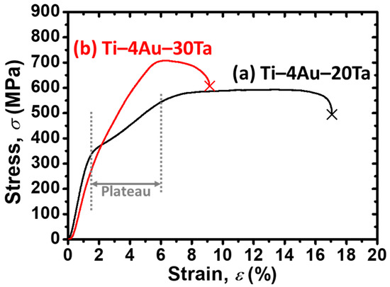 Stress–strain (SS; σ–ε) curves of the (a) Ti–4Au–20Ta alloy and the (b) Ti–4Au–30Ta alloy by the continuous tensile tests are shown in Figure 4. The cross symbols at the end of the SS curves suggest the fractures of the specimens. The strain until fracture of the (a) Ti–4Au–20Ta alloy was at approximately 17%, which was almost twice larger than that of the (b) Ti–4Au–30Ta alloy (i.e., deformation strain at approximately 9%), showed high elongation. The different ductility of these two alloys could be elaborated through the following reasons.