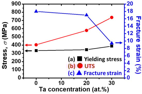 A functional mapping, which reveals (a) yielding stress (black squares), (b) ultimate tensile strength (UTS) (red circles), and (c) fracture strain (blue triangles) as a function of Ta concentration in the alloys, is shown as Figure 5. It is necessary to mention that for the purposes of completeness and comparison, the binary Ti–4Au alloy was cited from our preliminary research [35] and plotted in Figure 5. It is obvious that both the (a) yielding stress and the (b) UTS increased monotonically with Ta addition concentration. Similar to the explanation in Section 3.5, this enhancement in strength could be attributed to the solid–solution strengthening effect of the introduction of Ta element and the precipitation hardening effect caused by the Ti3Au precipitates. Slip of dislocation (i.e., plastic deformation) was inhibited by the introduction of the Ta impurity and the Ti3Au precipitates. Opposite to the strength, fracture strain (Figure 5c) of the specimens decreased with the introduction of Ta concentration due to the precipitation of the brittle Ti3Au intermetallic compound.