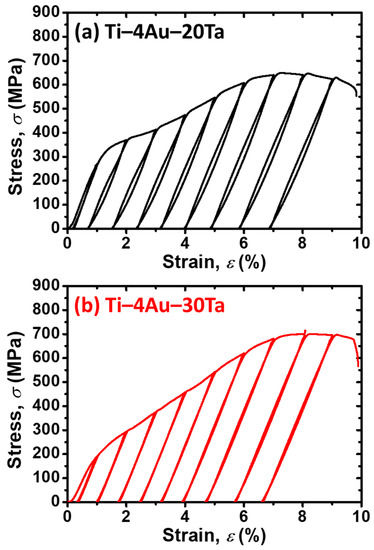 The cyclic loading–unloading tests of the (a) Ti–4Au–20Ta alloy and the (b) Ti–4Au–30Ta alloy are shown in Figure 6. Overall, it was found that the (a) Ti–4Au–20Ta alloy which exhibited slight pseudoelasticity (PE), showed slight shape recovery during unloading. While the (b) Ti–4Au–30Ta alloy showed almost no shape recovery during unloading in the cyclic loading–unloading tests at RT. Therefore, it could be deduced that the austenite transformation start temperature (As) is higher than the operation temperature (i.e., RT). In addition, the vanished shape recovery in the (b) Ti–4Au–30Ta alloy could be ascribed to the inhibition of the Ti3Au precipitates. On the other hand, the slight shape recovery in the (a) Ti–4Au–20Ta alloy could be attributed to the pseudoelasticity via the reorientation of martensitic variants, which is commonly observed in the martensite phase [45,46,47]. Moreover, similar to the results from the continuous tensile tests (Figure 4) in Section 3.5, the (b) Ti–4Au–30Ta alloy showed improved strength than that of the (a) Ti–4Au–20Ta alloy.
