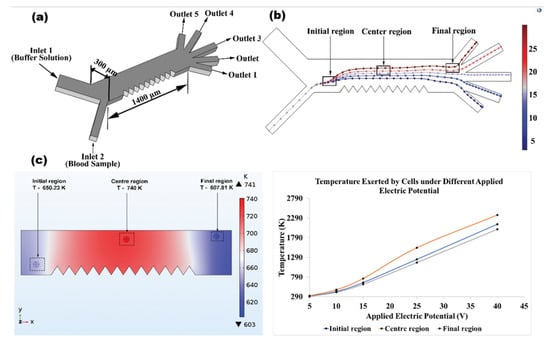 A microfluidic chip design with five outlets arrangements was successfully simulated to separate multiple targets in a single run. (a) The schematic illustration of five outlets device showing the dimensions with triangular electrodes arrangements in the side wall. (b) Simulation of particle streamlines reveals that cells of distinct sizes (25, 20, 15, 10, 7 µm) were selectively collected in target reservoirs. (c) Simulations verify that, strong joule heating was observed in center region of the channel where electric field gradient is very strong.