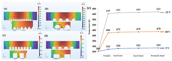 Simulation studies representing contribution of joule heating effects on various electrode shapes. (a) Triangular-shaped electrode generates fewer thermal gradients while maintaining reliable separation. The legend graph shows, temperature is around 310 K at the applied potential of 10 V. The insets are magnified views of electrode geometries showing the dimensions of the electrodes. (b) With same potential (10 V), semi-circular shape electrodes generate strong electric field leading to high temperature distribution inside the channel (around 322 K). (c) The square shaped electrode generates electric field more than semi-circular geometry (above 327 K). (d) Rectangular shaped electrode geometry produces even more electric field than square electrode (330 K) at 10 V. (e) The comparison plots reveal that triangular electrodes remain attractive even if applied potential is varied between 5 and 15 V, to keep the survival time of cells within threshold as compared to other electrode geometry, however increasing voltage beyond 15 V produces high joule heating (temperature beyond 400 K damages cell).