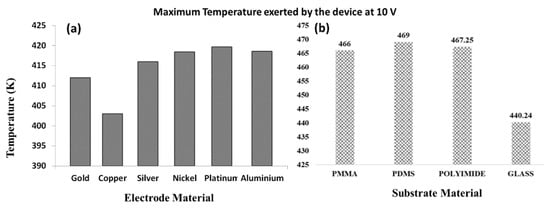 Not only the shapes, the choice of electrode materials also plays a key role in joule heating generation inside a microchannel. Therefore, our study was extended to investigate the effect of different electrode material which contributes to device performance and reliability. Materials such as gold, copper, silver, nickel, platinum, and aluminum are mostly used as electrode in microfluidic devices [39]. Since effective separation at low voltage of 5 V was demonstrated in previous section (Section 3.2), the simulation was performed on different electrode materials at this voltage range and change in temperature on each electrode was observed. The performance of the electrode for multiple runs was evaluated at 3 s. When the voltage was increased to 10 V, the device temperature increased to above 400 K. We observed ~10 K temperature variation in all the other electrodes compared to copper (see Figure 3a). Though copper electrode showed the least temperature distribution across the channel but due to electrode–fluid interaction, there is additional increase in device temperature when copper materials is used [14] and this will degrade and destroy the channel compared to gold and platinum. However, at 50 V, the temperature increases above 2000 K, which is quite high and may eventually lead to device failure. Further, we also observed that, change in different substrate materials causes variation in temperature distribution inside the microfluidic device that will ultimately contribute to joule heating effects. From Figure 3b, we noticed that glass substrate has the potential to generate the least amount of joule heating of 310 K compared to other substrate materials (PDMS, PMMA, polyimide).