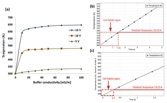 Simulation studies showing the effect of temperature at different conductivity level of the medium [10 mS/m to 100 mS/m]. (a) The plot of the temperature variation inside the channel reveals that, increases in conductivity causes increase in temperature at an applied potential of 5 V to 15 V. (b) While keeping buffer conductivity at 10 [mS/m] and applied potential of 10 V, the survival time of cells inside micro channel is found to be 1.45 s. This duration is sufficient enough to selectively deflect the cells to target outlets. (c) When the buffer conductivity is increased from 15 mS/m to 55 mS/m, the survival time is reduced to 0.3 s–0.1 s, this duration is very less for cells to survive inside the channel and will cause cell loss.