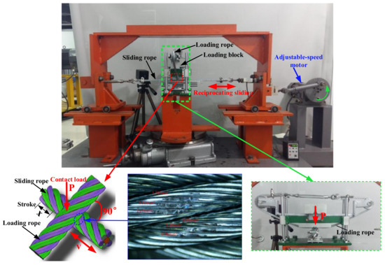 The mechanical properties of wire rope directly determine the safety of mine hoisting. Some scholars have performed much research work on the mechanical properties of wire rope by means of experiments. Mouradi et al. [13] monitored the damage evolution process of 19 × 7 non-rotating wire ropes through fracture tensile tests, and defined the different stages of damage evolution of the wire rope and the critical life fraction that may lead to sudden failure. In view of the negative influence of broken wires on the mechanical properties of wire ropes, Zhang et al. [14] conducted bending fatigue tests on the wire rope samples with different pre-broken wire distributions based on a self-made bending fatigue test device and found that broken wires increased the stress in the internal strands and the contact force between steel wires, thus reducing the service life of wire ropes. The friction and wear of wire ropes seriously threatens the safety and reliability of traction transmission equipment. In order to truly simulate the friction and wear behavior of two wire ropes when they cross contact, Chang et al. [15,16,17,18,19,20,21,22] made a self-made wire rope friction and wear testing machine, and tests with different working conditions, structural parameters, and environmental parameters were carried out. In addition, Peng et al. [23] set up a testing machine to simulate the impact of winding hoisting wire ropes, and found through tests that the increase of load, slip speed, and impact speed seriously threatened the mechanical properties of the wire ropes.