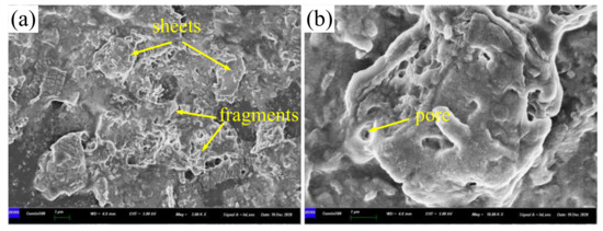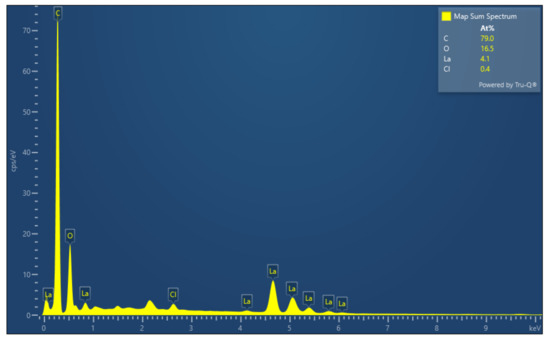 Figure 6 shows SEM images of lanthanum stearate. Lanthanum stearate is a typical lamellar structure with a sheet diameter of about several microns, a thickness of nanometer level, and irregular shape. Some small-sized fragments are randomly piled up on larger sheets or scattered everywhere. Some sheets are bonded together and form pore characteristics, which indicates that the prepared lanthanum stearate has many defects. Figure 7 presents EDS plane scan images of lanthanum stearate, and Figure 8 is an element content diagram of lanthanum stearate. The white-gray areas in Figure 7a are lanthanum stearate, the black areas are carbon conductive tape, so C element (Figure 7c) is densely distributed in the black areas, but not so densely distributed in the white-gray areas. However, La element (Figure 7e) and O element (Figure 7d) are densely distributed in white-gray areas, and La element is basically absent in the black areas, which also confirms the statement that the white-gray areas are lanthanum stearate. In addition, there is a certain amount of Cl element in lanthanum stearate (Figure 7f). Since the presence of Na element was not found (Figure 8), it is speculated that the residual Cl element is caused by the incomplete reaction of LaCl3·7H2O. Because the content of Cl element is extremely small, the atomic content is only 0.4%, so the influence here is negligible.