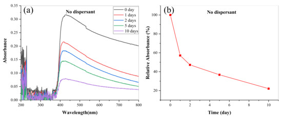 In order to further quantitatively analyze the dispersion stability of lanthanum stearate at low concentration, the absorbance values of the upper oil samples were measured. Figure 10 presents the evolution of absorbance of an oil sample added with 0.1 wt.% lanthanum stearate over time. It is clear that lanthanum stearate has an obvious absorption peak in the wavelength range of 400–800 nm, which corresponds to visible light absorption. After standing for 1 day, 2 days, 5 days, and 10 days, the relative absorbance was 57.16%, 47.22%, 36.76%, and 22.07%, respectively. This may be due to the fact that the dispersion force provided between the alkyl chain of lanthanum stearate and the hydrocarbon group of IRIS is equivalent to its own weight. With the increase of aggregates, the dispersion force is less than its own weight, which eventually leads to its precipitation. In addition, with the increase of days standing, the absolute value of the slope of the relative absorbance polyline gradually decreases, which indicates that the precipitation rate of lanthanum stearate in IRIS gradually slows down with the extension of time.