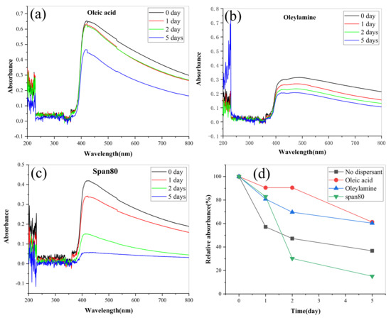 Variations of absorbance of LSMLO with different dispersants over time. (a) oleic acid; (b) Oleylamine; (c) span 80; (d) relative absorbance.