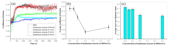 Figure 9 presents the variation of the dispersion stability of lanthanum stearate with different concentrations in IRIS with time. It can be seen that the precipitation rate of lanthanum stearate becomes obviously faster with an increase in the addition amount. After standing for 2 h, a certain amount of precipitation was produced at the bottom of the oil sample with the addition amount of 0.5 wt.%, but when the addition amount was less than 0.2 wt.%, the precipitation was not obvious. After standing for 24 h, the thickness of the sediment layer at the bottom of the oil sample with added 0.5 wt.% of lanthanum stearate was relatively large. The color of the oil sample also changed from the original white yellowish brown to a darker yellow, and the delamination phenomenon was obvious. In addition, the bottom of the oil sample with added 0.2 wt.% lanthanum stearate also produced partial precipitation. However, the precipitations of oil samples with the addition amount of 0.05 wt.% and 0.1 wt.% were inconspicuous, indicating that the smaller the addition amount, the slower was the precipitation. After standing for 48 h, the precipitation under various amounts of addition was not much different from that after standing for 24 h, which indicates that the precipitation mainly occurs in the first day. Although there are octadecyl chains in its molecular structure, when the amount of lanthanum stearate is large, the octadecyl chains are aggregated by dispersion forces due to the collision of molecules in Brownian motion. However, when the addition amount is small, the molecules are less likely to collide in Brownian motion, so the probability of agglomeration is also reduced and the precipitation is slower.