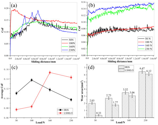 CoFs and wear areas of wire ropes under different contact loads lubricated with IRIS and LSMLO. (a) evolutions of CoF under IRIS lubrication; (b) evolutions of CoF under LSMLO lubrication; (c) comparison of average CoF between IRIS and LSMLO lubrication; (d) evolutions of wear area under IRIS and LSMLO lubrications.