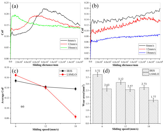CoFs and wear areas of wire ropes under different sliding speeds lubricated with IRIS and LSMLO. (a) evolutions of CoF under IRIS lubrication; (b) evolutions of CoF under LSMLO lubrication; (c) comparison of average CoF between IRIS and LSMLO lubrication; (d) evolutions of wear area under IRIS and LSMLO lubrications.