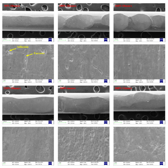 SEM images of wear scars of wire ropes lubricated with LSMLO.