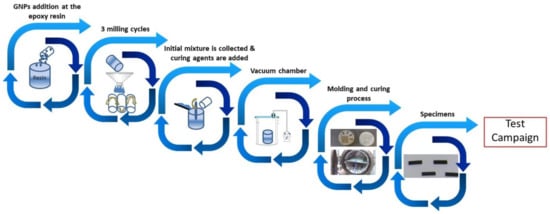 Nano-modified epoxy mixtures were produced using a three roll-mill, also known as calender, whose process is described in detail by Kostagiannakopoulou et al. [33]. After mixing the appropriate amount of GNPs and epoxy resin inside a glove box for safety reasons, the dispersed mixture was fed through the feeder roll and was collected at the apron roll of the calender, repeating this five times for each gap setting in order to obtain the homogeneous graphene-based blends. Following this, the other three components of the B-stage system were added to the prepared suspension and degassed in a vacuum chamber to avoid air inclusion. Then, the developed material was poured into silicon rubber molds and was cured in an autoclave oven, according to the manufacturer’s instructions, 2 h at 120 °C and 6 bars pressure. Following the aforementioned process, graphene-based nano-reinforced polymers at different loading levels were developed: 0.5, 1, 5, 10 and 15 wt.% GNPs. Neat epoxy samples were also manufactured for reference. Figure 1 presents the manufacturing process in detail.