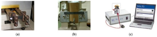 Experimental tools. Polymer specimen in the (a) DMA equipment, (b) Charpy Impact equipment, and (c) Thermal Conductivity set-up.