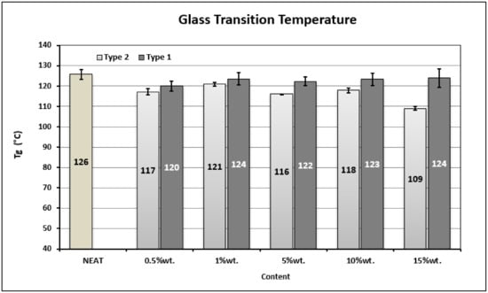 Thermo-mechanical tests were performed to define the glass transition temperature of produced nano-reinforced polymers. The glass transition temperature (Tg) of the developed nanocomposites was calculated by DMA tests and presented in Figure 3. It is observed that the Tg values of nano-reinforced polymers are slightly lower compared to those of the reference material. The presence of GNPs affects the crosslinking density of epoxy by restricting the size of polymer chains, thus facilitating their movement, although the presence of GNPs acts as mobility obstacles. The decrease in crosslinking lowers the heat release rate, and though the Tg is observed to be lowered in the case of nano-modified epoxy compared to the neat material [27]. Thus, the addition of GNPs into the polymer results in a slight degradation of Tg. This fact is in contrast to what was expected based on the literature. Generally, it is known that the presence of nanoparticles restricts the macromolecular movement in the nano-reinforced polymer, positively affecting the Tg of the polymer. The nano-size of GNPs limits the partial motion of polymer chains and results in higher temperatures, transiting the material from a glassy to a rubbery state [34]. However, as is obvious, the results of the present study were not in agreement with this approach. According to the literature [24], the size of the polymer chains, the good adhesion between the filler and matrix, the geometry and weight concentration of nanofillers, and finally the curing conditions are basic parameters that can significantly affect Tg. Taking into consideration that the curing conditions were the same for all the tested materials, it is concluded that the presence of GNPs, the quality of the adhesion and the geometry of the fillers affect the size and the mobility of polymer chains and finally result in the slight decrease of Tg. It is also shown that the Type 2 GNPs affect the Tg more negatively than the Type 1 GNPs do.
