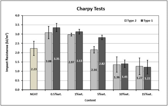 Impact experiments (Charpy tests) were conducted to study the contribution of Type 1 and Type 2 GNP materials to the impact resistance of the resin. Figure 4 depicts the energy absorption during the impact tests of the material per square meter. It is evident that the use of both GNP types proved efficient and led to a remarkable increase of the impact resistance compared to the neat material. Additionally, it was observed that the Type 1 material performed better at a content of 0.5 wt.% than Type 2 did, noting the maximum increase (50%) compared to the reference epoxy. The highest aspect ratio of Type 1 graphene promotes its improved impregnation by the polymer and thereby increases the contact surface between the two constituents (matrix and nano-reinforcement). This leads to the formation of a more extensive and stronger interface between the nanoparticles and the epoxy matrix, which results in a more efficient load transfer and the activation of additional energy absorbing mechanisms (pinning, bifurcation) activated by GNPs during fracture [31].