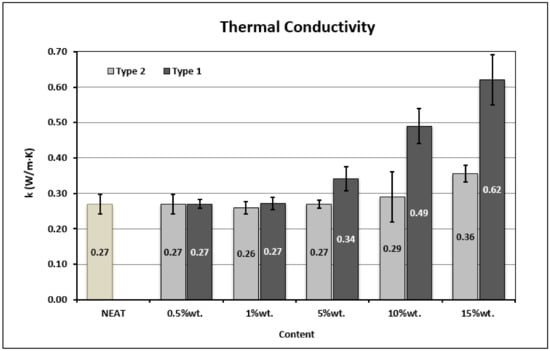 Moreover, polymers doped with Type 1 GNPs proved more conductive compared to Type 2 at the same weight content, for all loading levels (1, 5, 10 and 15 wt.%). The greatest difference between the thermal conductivity values was observed at the content of 15 wt.%, where polymers with a Type 1 reinforcement exhibited a 72% higher thermal conductivity than those with a Type 2 reinforcement. The thermal contact resistance between GNPs and the interfacial thermal resistance between the matrix and the GNPs considerably affect the thermal conductivity of the resulting nanocomposite. It is argued that the thermal contact resistance of polymers with Type 2 is much higher than that of Type 1, since the number of graphite interfaces of the conductive network is much higher and the phonon scattering will restrict the thermal conductivity.