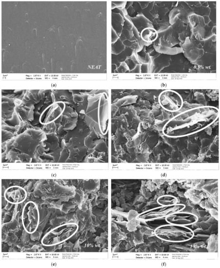 SEM images of the neat and nano-reinforced polymers enhanced with different contents of Type 2 GNPs: (a) neat, (b) 0.5 wt.%, (c) 1 wt.%, (d) 5 wt.%, (e) 10 wt.% and (f) 15 wt.% White circles indicate the agglomerates formed between the GNPs inside the polymers.