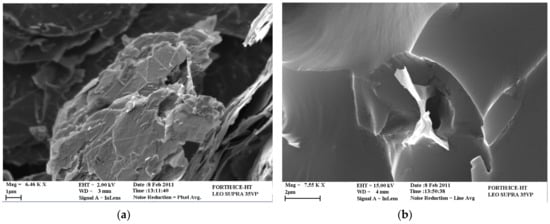 In particular, it is observed that the thermal conductivity of the resin system was significantly increased in the case of polymers that were reinforced with higher contents of GNPs (>5 wt.%) for both types. The explanation for this behavior is that with the increase of the GNPs content, the distance between the adjacent platelets is reduced, as is evident in the SEM images of Figure 6. This set-up leads to the reduction of the thin, insulated polymer film, which exists between the two constituents (matrix and filler), thus facilitating the phonon transport between them and consequently leading to a higher thermal conductivity. For a GNPs content higher than 5 wt.%, it is obvious that the thermal conductivity of the nano-reinforced polymer starts to increase when increasing the GNPs content in the polymer. Figure 5 shows that the highest increase of 130% occurred at the highest GNPs content (15 wt.%) οf Type 1 (thinner) GNPs in the polymer.