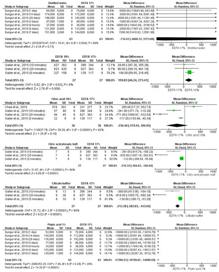 Mean standard deviation (SD) and the total number of samples in each group (EDTA and other irrigants) were included, and the mean difference (MD) with a 95% confidence interval (CI) was calculated. A fixed-effect model was applied when a low number of studies was included (three or fewer comparisons), and a random effect model was applied when four or more comparisons were included in the meta-analysis [20]. Heterogeneity was tested using the I2 index.