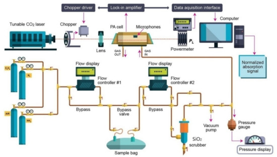 Over the last years, the photoacoustic spectroscopy laser-based tool was taken into consideration as a high sensibility method, with consideration to the conventional spectroscopic techniques [10,11,12,13,14]. Infrared absorption spectroscopy is an usual technique to acquire spectral signatures of chemical compounds with high resolution and high sensitivity [8,10,17].