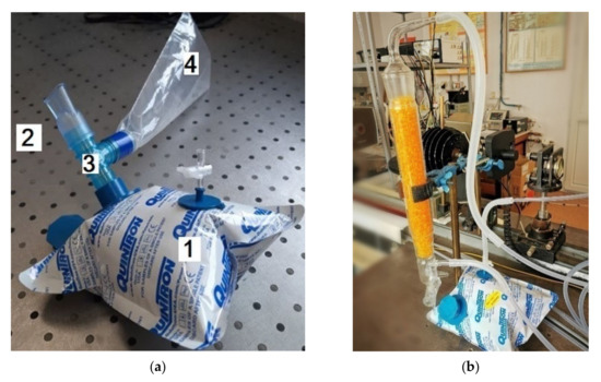 (a): 1—0.75 L Aluminium-coated bags (QuinTron, USA); 2—Mouthpiece; 3—Tee connector; 4—0.40 L Discard bag;(b) Connected SiO2 trap and aluminum-coated bags.