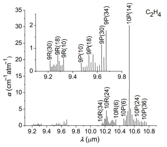 As one can observe from Figure 3, the corresponding C2H4 absorption concentration at every laser wavelength was determined and the maximum absorption for C2H4 was at 10.53 µm, which corresponds to 10P(14) CO2 laser line. The image below shows an enlarged view for the 9-μm band determinations.