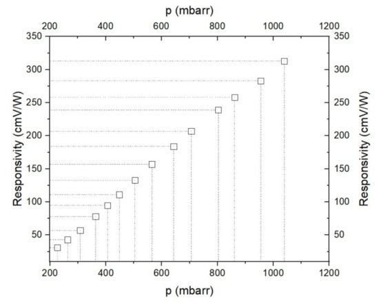 An important parameter in the measurements is represented by responsivity R (cmV/W) of the cell, which depends on the gas pressure inside the cell (Figure 4).