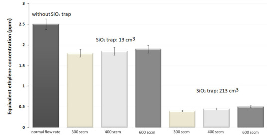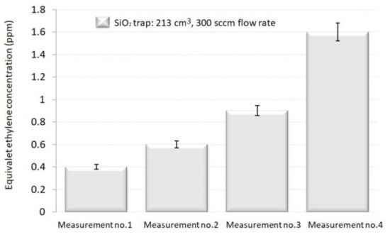 In the case of the larger SiO2 trap (volume of 213 cm3 and a controlled flow rate of 300 (sccm) in the H2O removal (Figure 6), the equivalent C2H4 concentration increased by 1.5. times for the second run, by 2.25 times for the third, and by 4 times for the fourth.